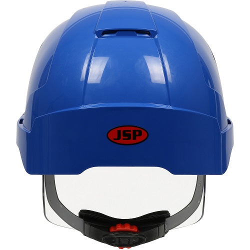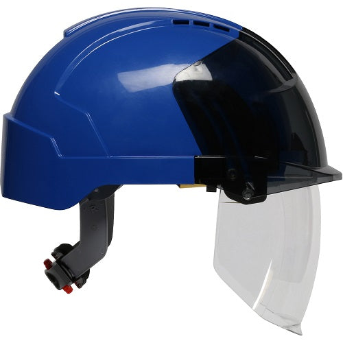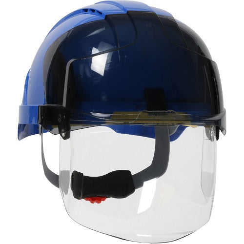 JSP® EVO® VISTAshield™ next-generation industrial safety helmet offers premium comfort and features integrated ANSI Z87.1 Faceshield coated for scratch and fog resistance offering an unobstructed panoramic view with minimal distortion. The fully adjustable face shield is easy to retract and deploy and pivots smoothly allowing the wearer to adjust the position and for maximum coverage and protection. 6-Point polyester textile suspension with Revolution™ Wheel Ratchet is easy to use and creates a firm comfortable fit. Excellent for applications that require protection from falling debris and low-hanging objects in industrial and construction applications.