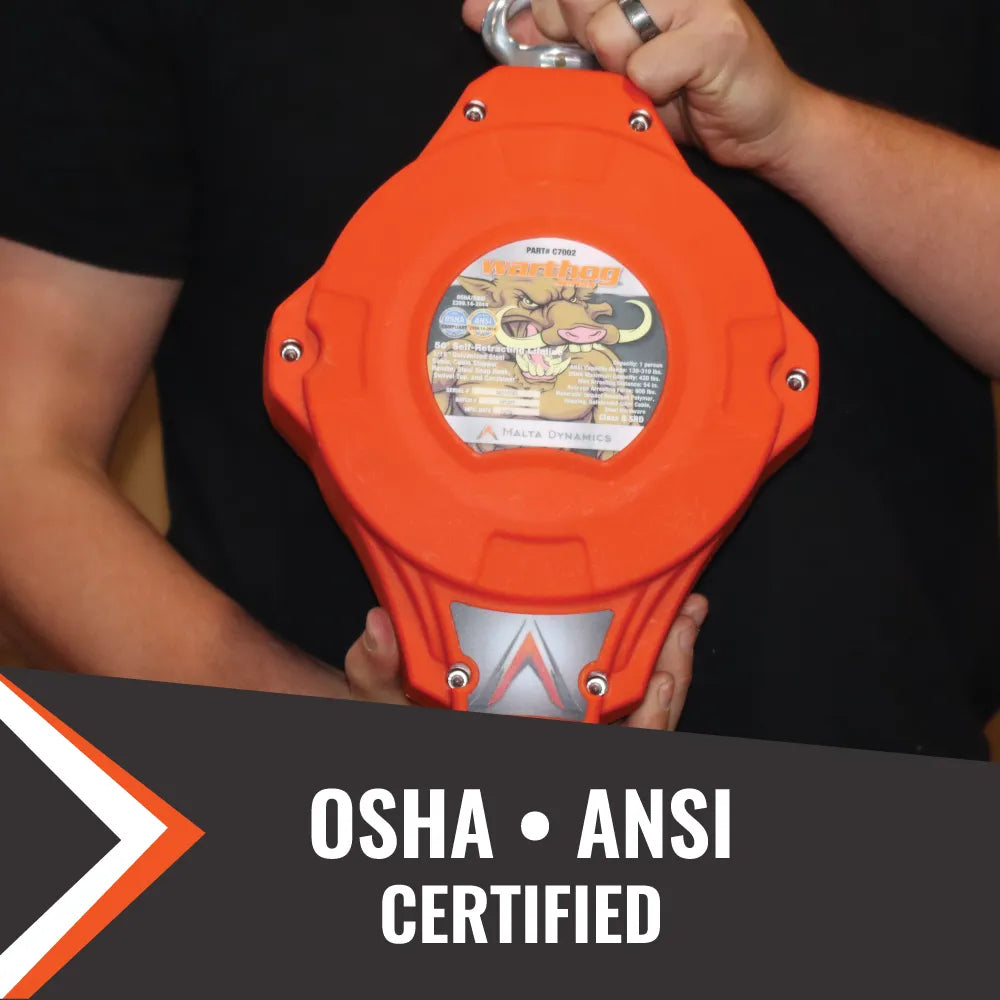 Malta Dynamics Warthog® Series Self Retracting Lifelines are some of the most durable SRLs available today, and are manufactured in lengths ranging from 10’-100’. They are made of galvanized steel cable and high-strength thermoplastic polymer for additional strength and durability. All Malta Dynamics Warthog® SRLs are tested to the strict ANSI protocols and meet all applicable OSHA standards.