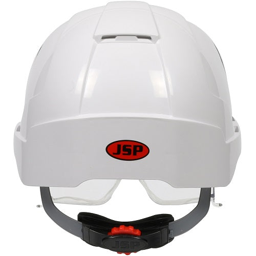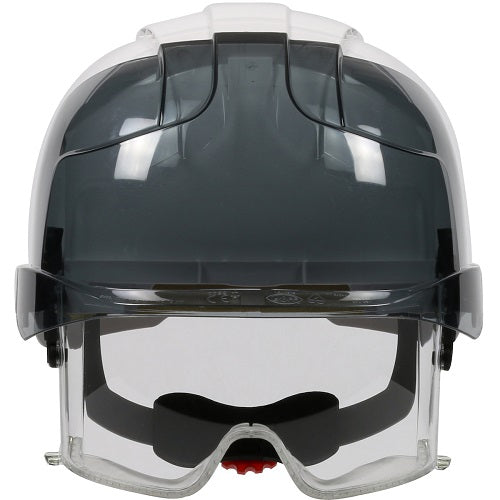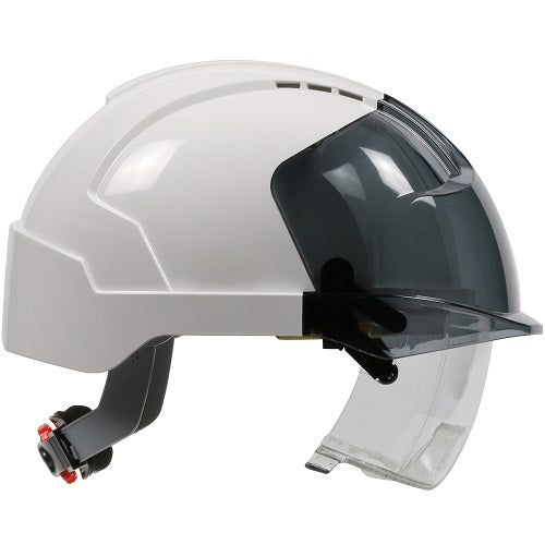 JSP® EVO® VISTAlens™ next-generation industrial safety helmet offers premium comfort and features integrated ANSI Z87.1 lens coated for scratch and fog resistance offering an unobstructed panoramic view with minimal distortion. The fully adjustable lens is easy to retract and deploy and pivots smoothly allowing the wearer to adjust the position and for maximum coverage and protection. 6-Point polyester textile suspension with Revolution™ Wheel Ratchet is easy to use and creates a firm comfortable fit. Excellent for applications that require protection from falling debris and low-hanging objects in industrial and construction applications.
