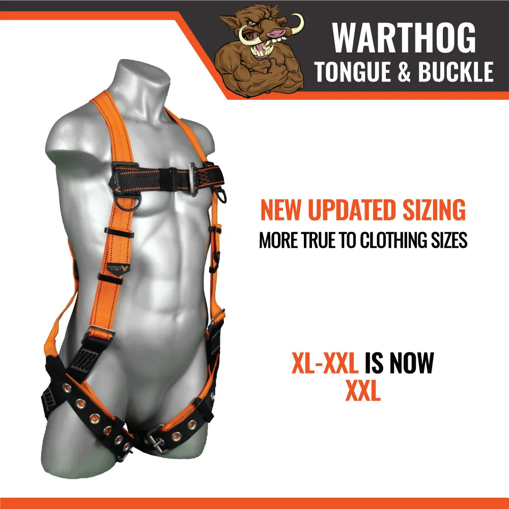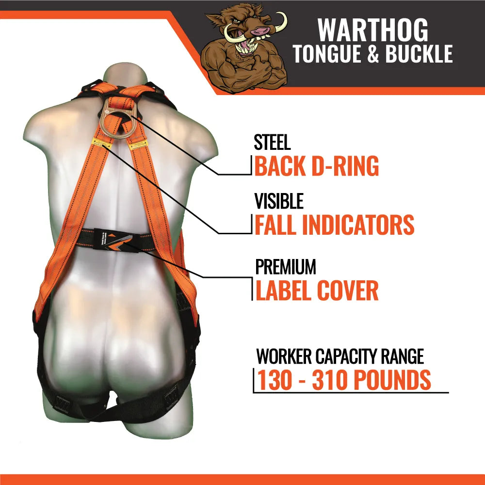 The Warthog Full Body Harness with Tongue Buckle Legs is the best available economy harness on the market. The Warthog has dual lanyard keepers to hold lanyards out of the way while working. The Warthog also comes with a customizable patch where workers can record information on harnesses without jeopardizing webbing integrity. The Warthog is designed for efficiency and affordability while meeting the strict ANSI and OSHA testing requirements and standards.