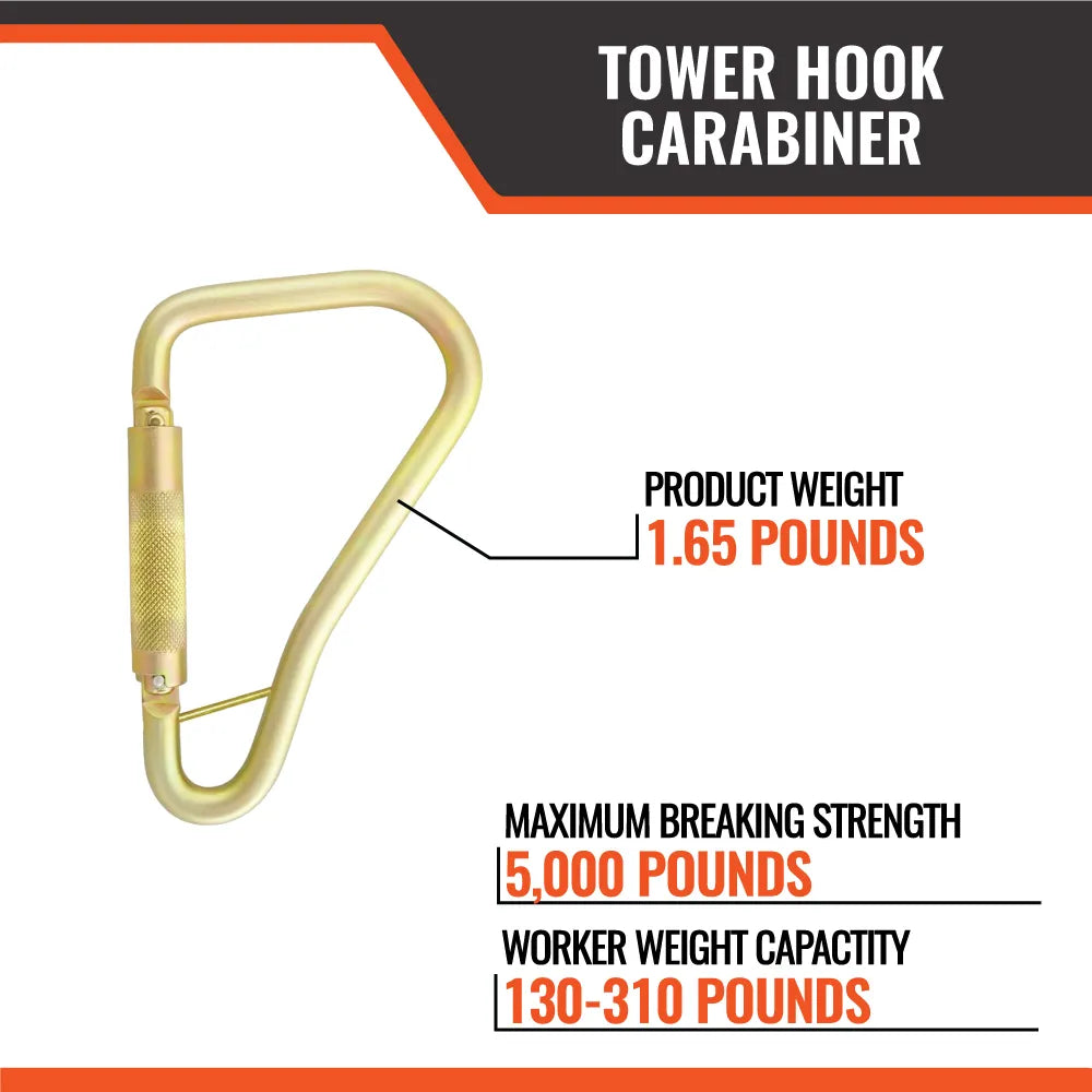 The Malta Dynamics Tower Hook Carabiner is a larger version of the High Strength Steel Locking Carabiner. It is designed to be durable and easy to use. The wider gate allows for increased versatility. With the Tower Hook Carabiner, you can attach one component to another and maintain maximum strength and durability.